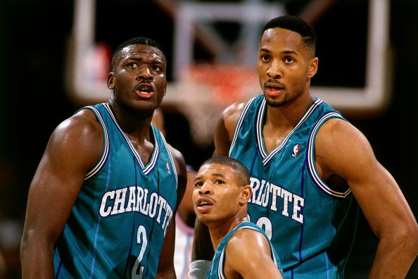 CHARLOTTE, NC - 1993: (L-R) Larry Johnson #2, 'Mugsy' Bogues #1 and Alonzo Mourning #33 of the Charlotte Hornets take a break during an NBA game circa 1993 at The Charlotte Coliseum in Charlotte, North Carolina. NOTE TO USER: User expressly acknowledges and agrees that, by downloading and or using this photograph, User is consenting to the terms and conditions of the Getty Images License Agreement (Photo by Andrew D. Bernstein/ NBAE via Getty Images)