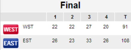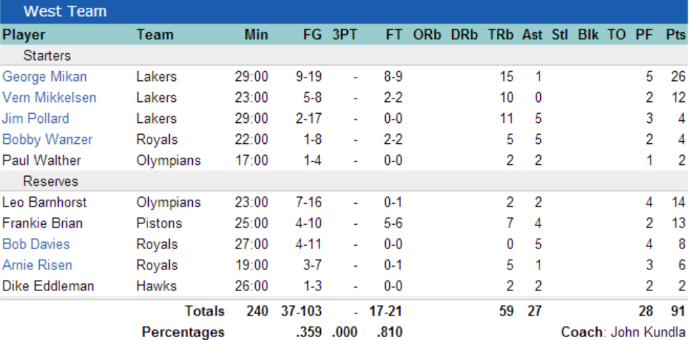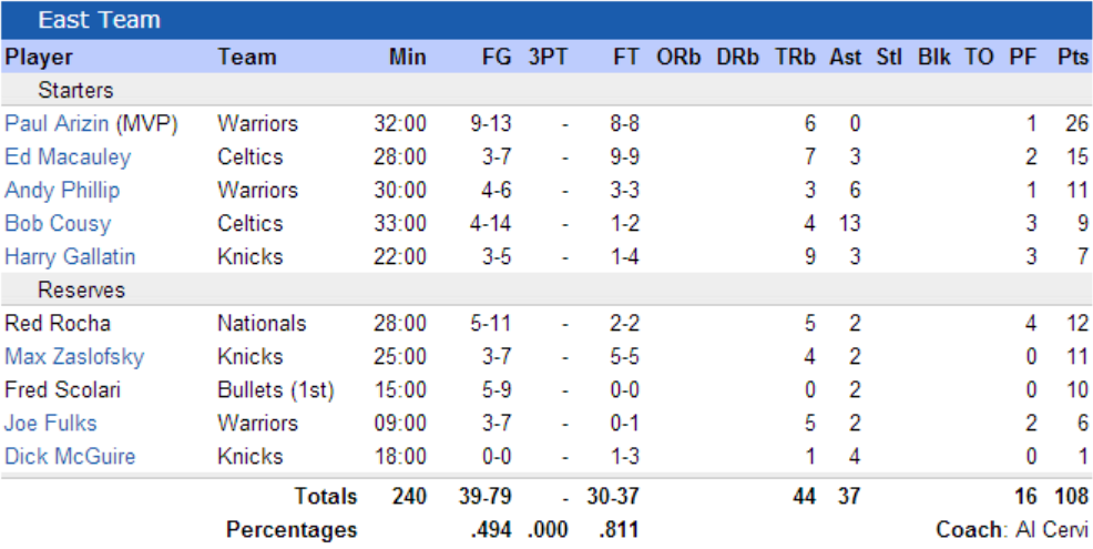 Une promenade de l’Est (16-3) dans les cinq dernières minutes régale un combat dominé par deux joueurs, Paul Arizin des Warriors de Philadelphie avec 26 points et 6 rebonds, et le pivot des Lakers, George Mikan avec 26 points et 15 rebonds. Arizin qui réussit 9 de ses 13 tentatives hors de la raquette et ses huit lancer-francs lui permettent de remporter le trophée de MVP de la rencontre. A noter que Bob Cousy, le magicien des parquets a réalisé la belle prestation de 13 décisives, un record à l’époque.