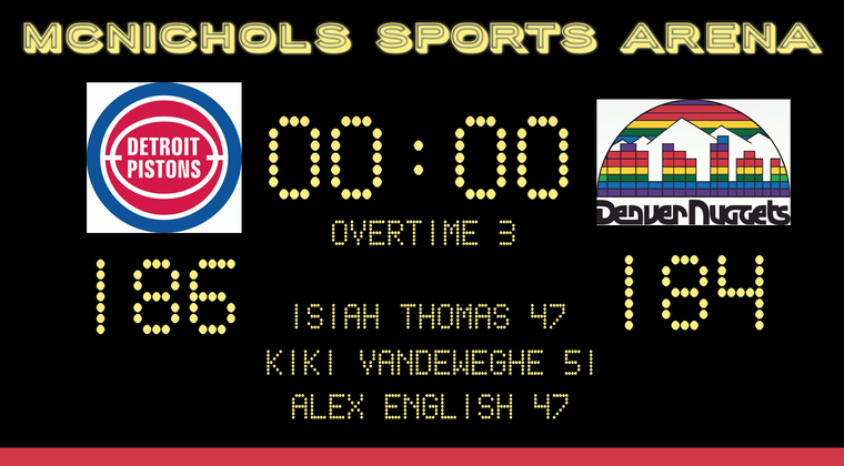 Ce 13 décembre 1983, une autre immense performance fut réalisée. Deux membres d’une même équipe ont marqué plus de 40 points, et qui plus est dans les deux équipes (Kiki Vandeweghe 51, Alex English 47 pour Denver et Isiah Thomas 47, John Long 41 pour Detroit). Bref, du délire!