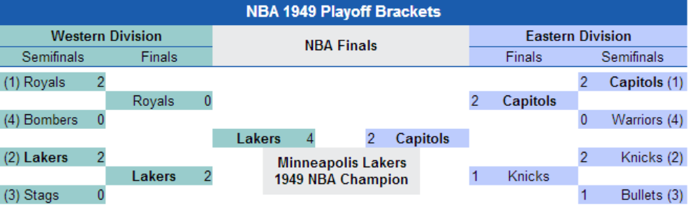 On retrouvera donc en Playoffs des affiches alléchantes opposant à l’Ouest : les Royals aux Bombers et les Lakers aux Stags. A l’Est, on retrouvera les tenants du titre les Baltimore Bullets face aux New York Knicks et les Warriors face aux Capitols.
