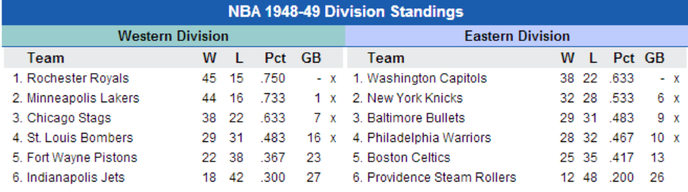 Forte de 12 équipes, disputant chacune 60 matches, la Ligue voit les Washington Capitols dominer la Division Est et les Rochester Royals dominer l’Ouest avec seulement une victoire de plus que les Lakers.