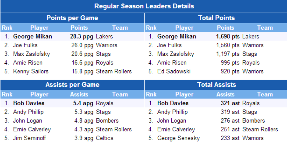 Pour la première fois, les plus belles salles et les meilleurs joueurs sont réunis dans les plus grandes villes des Etats-Unis. Parmi eux, la première grande star de l’histoire de la Ligue va faire son apparition : George Mikan, l’intérieur des Minneapolis Lakers va révolutionner le jeu intérieur et finir la saison régulière avec 28,3 points de moyenne par match.