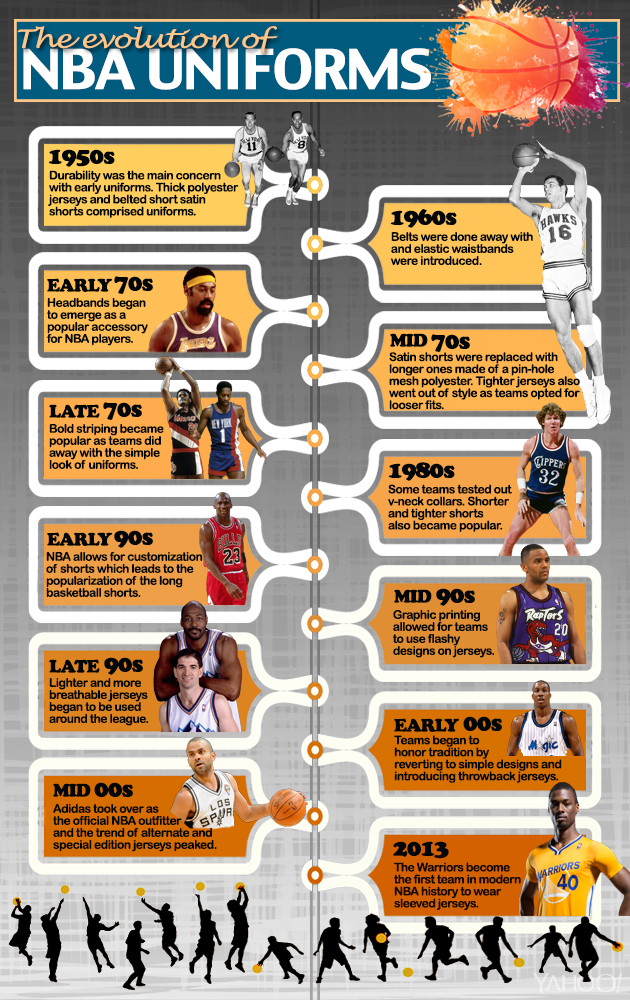 Les maillots de la Grande Ligue ont parcouru un long chemin depuis les années 50. Dans les années 70, l’ABA a ainsi fait évolué le maillot en y ajoutant des bandes sur le Jersey et même des étoiles pour les Bullets et les Nets. Le rouge, le bleu et le blanc étaient donc de mise, avant de retrouver les shorts courts dans les années 80. Même si le maillot à manches porté actuellement par les joueurs NBA n’est guère apprécié par tous, il en demeure une révolution en 70 ans. A vous de juger !