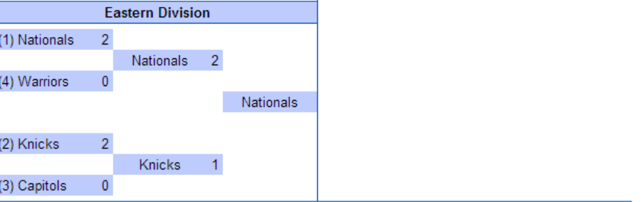 A l’Est les qualifiés sont les Nationals, Warriors, Knicks et Capitols. Ces 4 équipes s’affrontent en demi-finales de Division où les deux premiers de la Division (Knicks et Capitols) sweeperont leurs adversaires par 2 victoires à 0. En finales de Division les Capitols s’imposeront 2 victoires à 0 et accèderont aux Finales NBA. En effet, vu la disposition des Playoffs cette année-là, les équipes évoluant à l’Est avaient un tour de moins que celle des autres divisions qui devaient se rencontrer avant de jouer les Finales NBA.