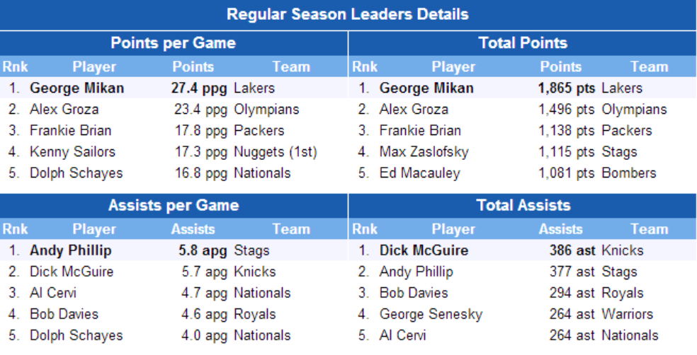 Cette saison là, c’est George Mikan qui remporte une deuxième fois d’affilée le titre de meilleur scoreur de la Ligue avec une moyenne de 27,4 points de moyenne. « Mikan était impossible à arrêter quand il était sur le terrain » déclara un joueur de Syracuse.