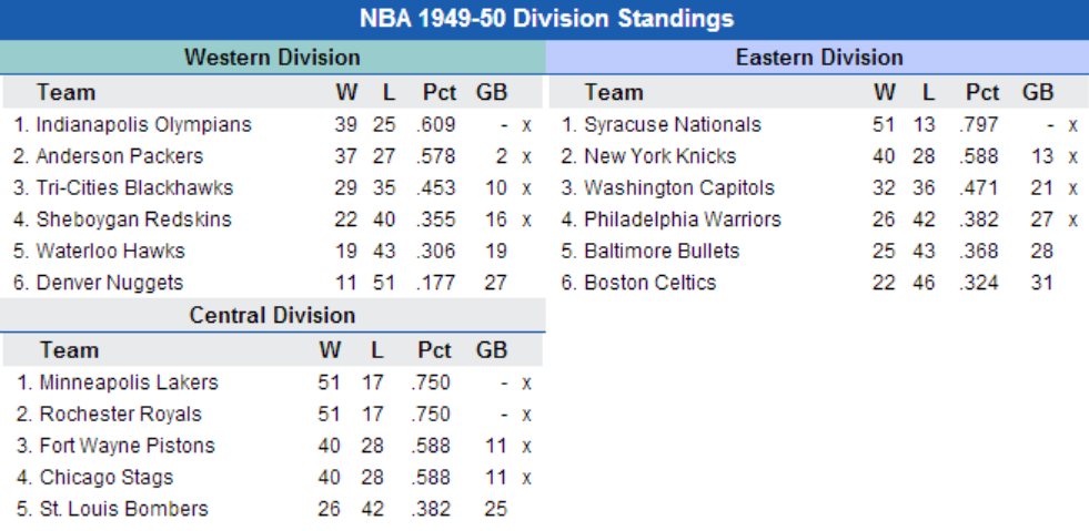 Les Indianapolis Jets et les Steamrollers Providence disparurent en 1949 de la BAA, mais la fusion avec la NBL permit l’intégration de 7 nouvelles franchises : Anderson Packers, Denver Nuggets, Sheboygan Redskins, Syracuse Nationals, Tri-Cities Blackhawks, Waterloo Hawks et les Indianapolis Olympians. A noter également la première apparition d’un joueur noir américain dans le championnat : Nat Clifton. Ce fut également la première saison de figures légendaires de la Ligue : Bob Cousy et Red Auerbach.