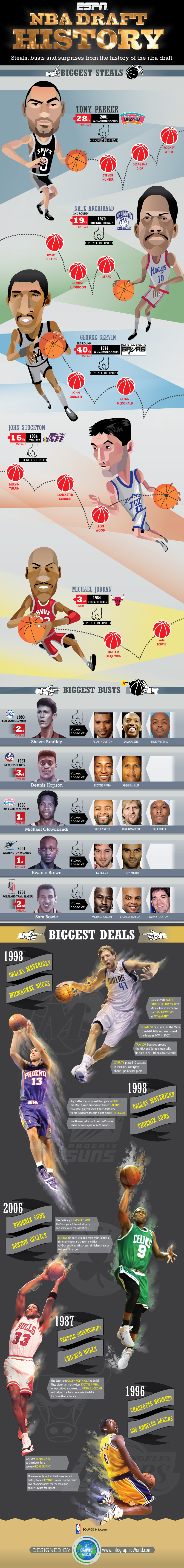 Alors que la 68ème Draft NBA aura lieu au Barclays Center de Brooklyn dans la nuit de jeudi à vendredi, Basket Retro vous propose de revisiter les plus belles surprises de cet événement à travers cette infographie signée Infographic World. Elle nous propose de revisiter l’histoire de la Draft NBA en nous dévoilant les choix de draft les plus judicieux, les plus gros bides, ainsi que les plus gros deals de son histoire.