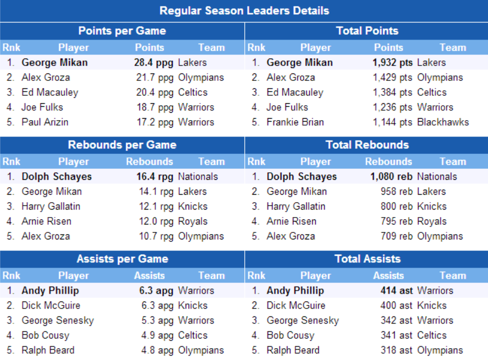 Malgré le faible nombre d’équipes présentes cette année-là on peut noter un resserrement du niveau de la Ligue : à l’Est les Warriors, les Celtics et les Knickerbockers se tiennent dans un mouchoir de poche et à l’Ouest les doubles tenants du titre que sont les Lakers sont talonnés de près par les Royals.