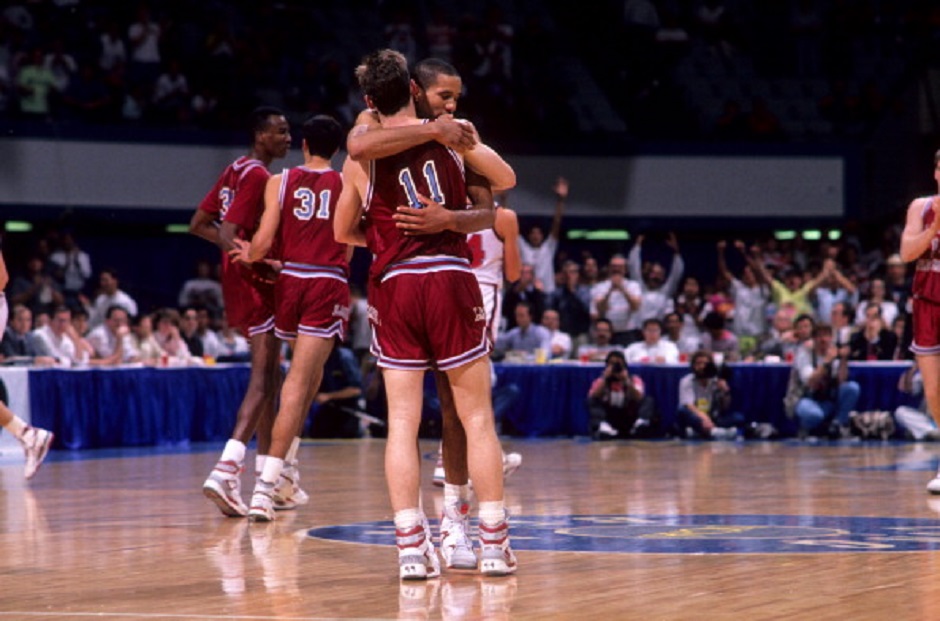 College Basketball: NCAA Playoffs: Loyola Marymount Bo Kimble (30) victorious hugging teammate Tom Peabody (11) during game vs New Mexico State at Long Beach Sports Arena. Long Beach, CA 3/16/1990 CREDIT: Andy Hayt (Photo by Andy Hayt /Sports Illustrated/Getty Images) (Set Number: X39568 TK8 R1 F19 )