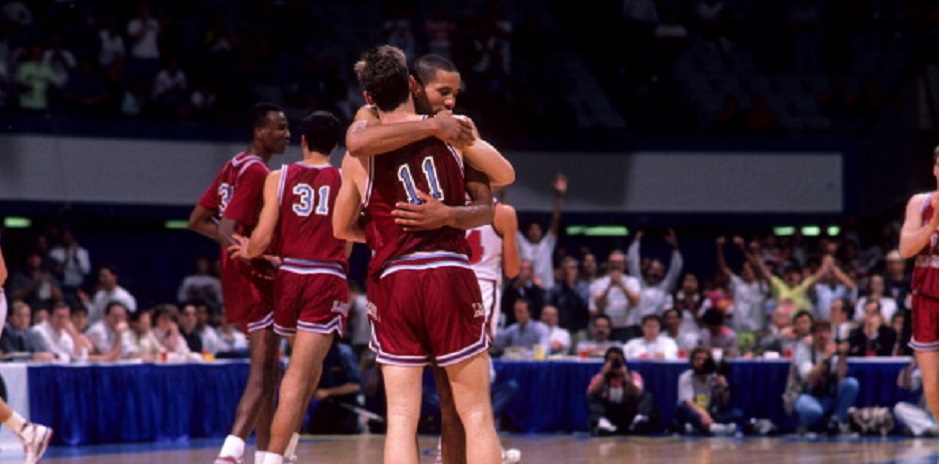 College Basketball: NCAA Playoffs: Loyola Marymount Bo Kimble (30) victorious hugging teammate Tom Peabody (11) during game vs New Mexico State at Long Beach Sports Arena. Long Beach, CA 3/16/1990 CREDIT: Andy Hayt (Photo by Andy Hayt /Sports Illustrated/Getty Images) (Set Number: X39568 TK8 R1 F19 )