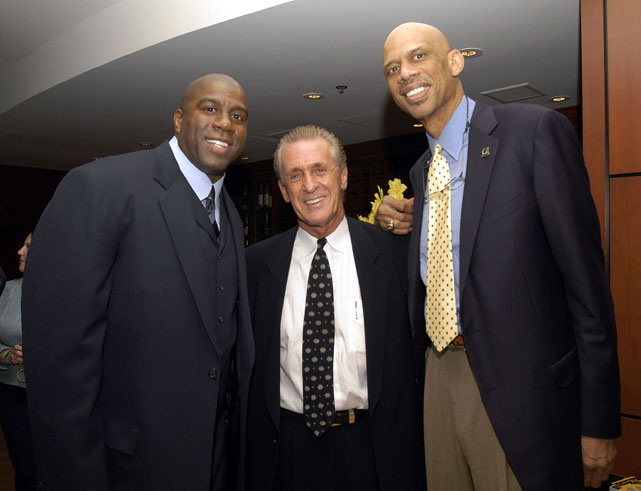 Riley au côté de Magic Johnson et Kareem Abdul Jabbar : les trois hommes ont marqué l’histoire des Lakers dans les années 80. (c) Andrew D.Bernstein – Getty Images