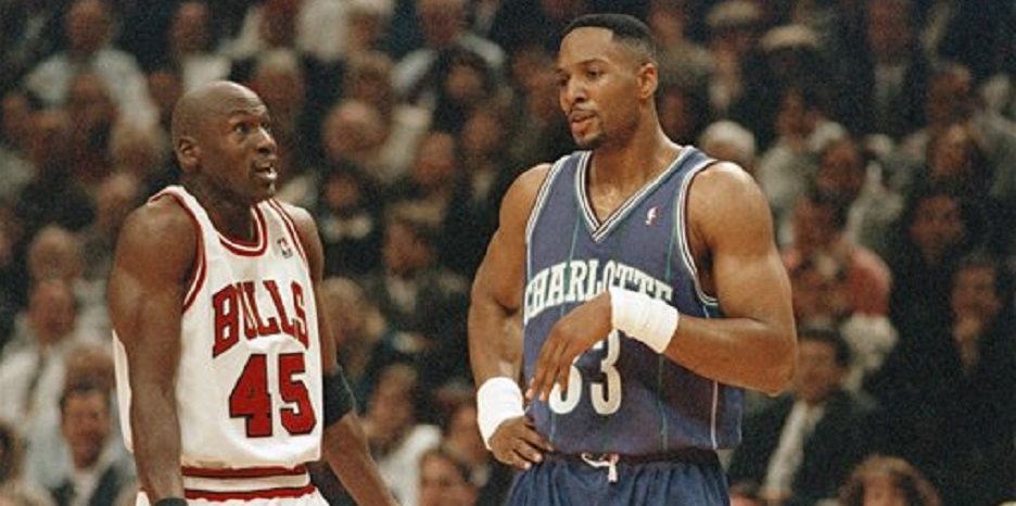 Chicago Bulls' Michael Jordan, left, and Charlotte Hornets' Alonzo Mourning talk on the floor during the fourth quarter of the Bulls' 103-80 victory, Tuesday, May 2, 1995 in the Eastern Conference Playoffs in Chicago. Chicago leads Charlotte 2-1 in the best-of-five series. (AP Photo/Fred Jewell)