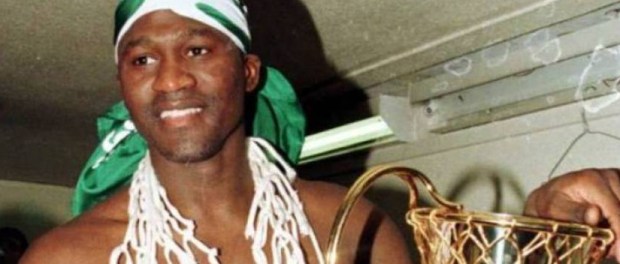 Dominique Wilkins tout sourire avec un bandana aux couleurs du Pana et le trophée (c) paobc.gr