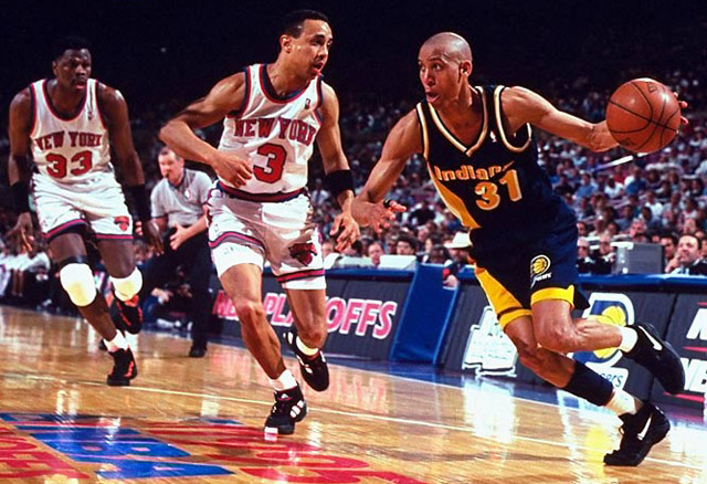 En 1993-1994, les Pacers achèvent leur saison sur une série de 8 victoires consécutives et arrachent la 3ème place de leur conférence. Reggie Miller s’illustre lors des playoffs 1994, emmenant son équipe jusqu’en finale de conférence face à New York. Les Knicks l’emportent au 7ème match, après un duel mémorable. Miller est au sommet de son art et de sa popularité.