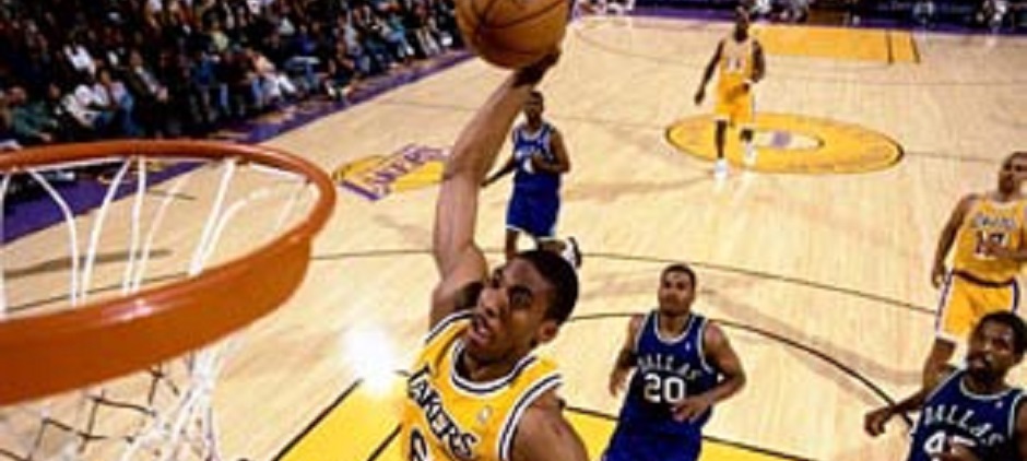 LOS ANGELES - 1998: Eddie Jones #6 of the Los Angeles Lakers goes for a dunk against the Dallas Mavericks during the NBA game at the Forum in Los Angeles, California. NOTE TO USER: User expressly acknowledges and agrees that, by downloading and/or using this Photograph, User is consenting to the terms and conditions of the Getty Images License Agreement. Mandatory Copyright Notice: Copyright 1998 NBAE (Photo by Garrett W. Ellwood/NBAE via Getty Images)