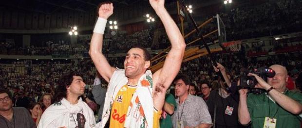 Richard Dacoury heureux après la victoire du CSP face à Trévise, le 15 avril 1993 (c) Olivier Morin - AFP