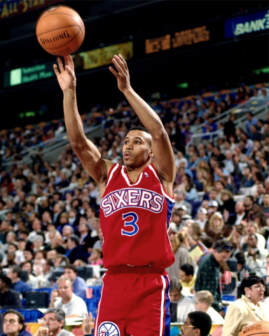 Détenteur du record de rencontres consécutives avec au moins un panier à trois-points marqué (depuis battu par Kyle Korver avec 127 rencontres contre 89), Dana Barros (49 ans aujourd’hui) s’est également illustré un soir de janvier 1994 en marquant l’un des Buzzer Beater les plus incroyables de l’histoire de la ligue.