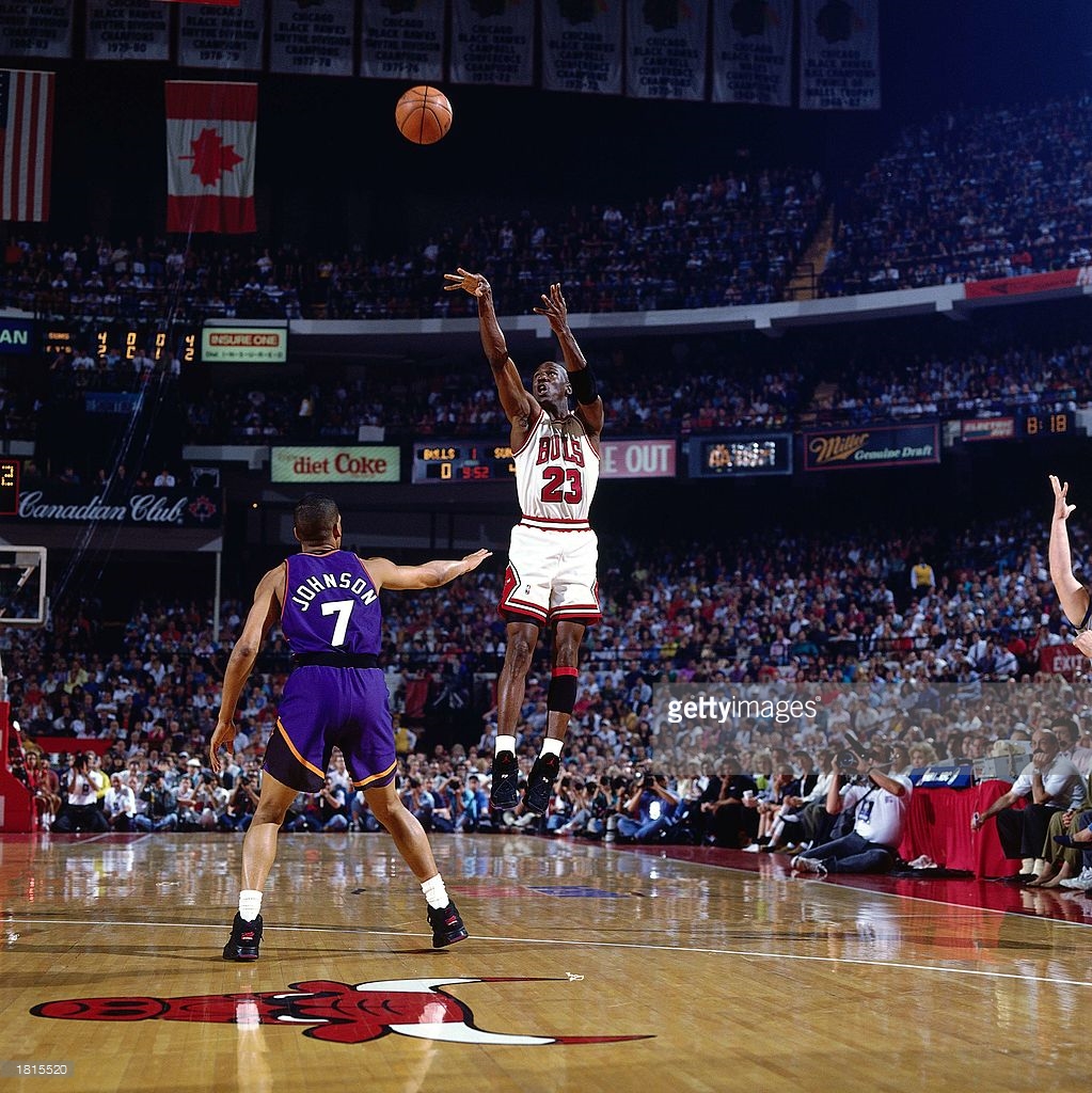 Jordan au shoot lors du Game 5 de la finale 1993 à Chicago Stadium (c) Getty Jordan au shoot lors du Game 5 de la finale 1993 à Chicago Stadium (c) Getty