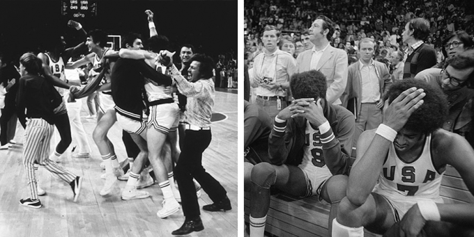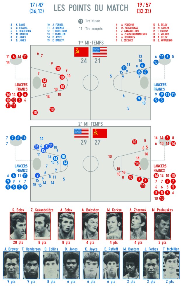 Outrepassant ses droits et sa fonction, le Britannique exige que l’on rejoue cette ultime séquence. Personne à la table des officiels, y compris le délégué technique, le seul a être habilité à prendre une telle décision, n’ose contredire le « boss ». On remet le chrono à moins trois secondes. McMillen se presse sur la ligne de fond adverse pour gêner la remise en jeu de Palauskas. Mais l’arbitre bulgare, Artenik Arabadjan, le fait reculer encore et encore. Mc Millen, de peur d’une faute technique, s’exécute ne sachant plus trop où se postionner. Paluskas a le champ libre pour lancer une incroyable passe de quarterback qui décrit une courbe parfaite sur toute la longueur du terrain. Alexandre Belov s‘en saisit sous l’arceau américain, un petit move, (marché ?), Bantom à terre, (faute offensive ?). Shoot ! 51/50 ! Les Etats-Unis d’Amérique viennent de perdre leur premier match olympique depuis 36 ans. L’Union des Républiques Socialistes et Soviétiques est championne olympique. C’est un véritable séisme. Dans la confusion, démonstration de joie des Soviétiques, réclamation des Américains, le public est invité par le speaker à quitter la salle. La remise des médailles est remise à une date ultérieure.