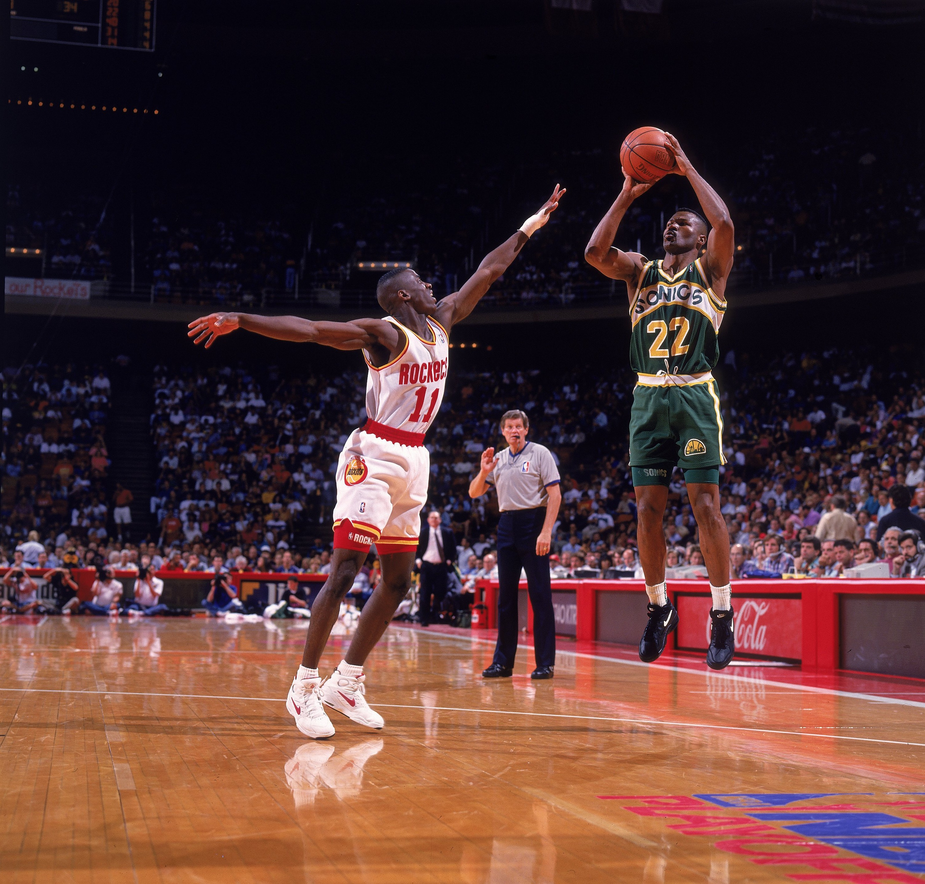 UNITED STATES - MAY 15: Basketball: NBA Playoffs, Seattle SuperSonics Ricky Pierce (22) in action, taking shot vs Houston Rockets Vernon Maxwell (11), Game 3, Houston, TX 5/15/1993 (Photo by John W. McDonough/Sports Illustrated/Getty Images) (SetNumber: X44357)
