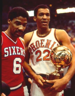 Larry Nance avec le trophée du Slam Dunk contest au côté de Julius Erving, le finaliste (c) nba com Larry Nance avec le trophée du Slam Dunk contest au côté de Julius Erving, le finaliste (c) nba.com