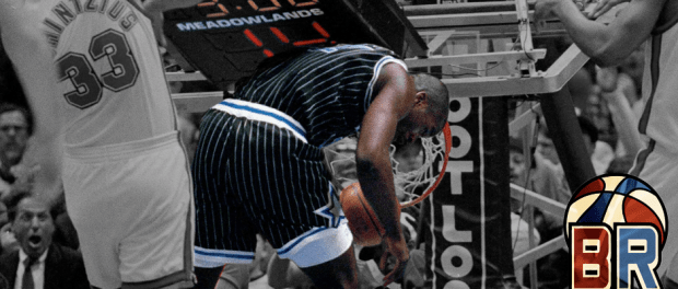 Démunis sous les panneaux, les Nets semblent n’avoir aucune parade pour contrer le phénomène et ce ne sont pas les Sam Bowie, Rick Mahorn ni le « cartoonesque » Dwayne Schintzius qui peuvent intimider le jeune colosse. Pourtant, et contre toute attente, le prodigieux rookie a bien du mal à mettre en place son jeu durant la partie. Victime de prises à deux systématiques, l’accès au cercle lui est constamment barré et il doit alors s’en remettre à une panoplie de gestes en poste bas alors encore peu maîtrisée, comme en atteste d’ailleurs son horrible pourcentage durant la partie avec un cuisant 3 sur 11 aux tirs. Frustré par sa production, le Shaq va alors déployer toute sa rage pour imposer son physique. Positionné près de la ligne de fond, et à l’opposé de la pénétration de son coéquipier Anthony Bowie, c’est sur une passe aveugle, qui permet de leurrer les intérieurs des Nets, que le Shaq parvient à s’imposer dans la peinture. Dès la réception de la balle, il prend immédiatement ses appuis sous le cercle avant de s’élever, en un instant, de toute sa masse (2,16 cm pour 136 kg tout de même!). Malgré la faute de boucher commise par le toujours très élégant Schintzius, le joueur des Magic parvient à délivrer un dunk plein de rage et de fureur. Face à un tel déploiement d’énergie, le panier rompt immédiatement avec son socle.