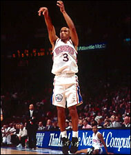 Tony-Delk-(2000-02)Présent sur le parquet avec les Warriors le soir de la performance de Tracy Murray, Tony Delk connaitra son jour de gloire quelques années plus tard avec les Phoenix Suns. Star universitaire et Most Oustanding Player du Final Four 1996 remporté par Kentucky, Delk est drafté par les Hornets à la sortie de Collège. Scoreur en sortie de banc à Charlotte, puis Golden State et Sacramento, il signe à Phoenix au début de la saison 2000-01 avec toujours le même rôle. Dans un effectif riche, il est le back-up de luxe de Mario Elie dans l’Arizona. Alors quand Super Mario se blesse un soir de décembre 2000, Delk est propulsé dans le 5 de départ des Suns au côté de Jason Kidd. Et c’est une nouvelle fois face à son ancienne équipe que Delk va sortir une performance venue d’ailleurs dans lors d’une rencontre entre deux des meilleurs équipes de la conférence Ouest. Face aux Kings de Sacramento, Delk inscriera la bagatelle de 53 points à 20 sur 27 au shoot en 50 minutes mais ne pourra empêcher la défaite de son équipe en prolongation, 121 à 117. Au contraire de Barros, Burton ou Murray, la performance de Delk est remarquable car elle a été réalisée lors d’un match serré et à enjeux.