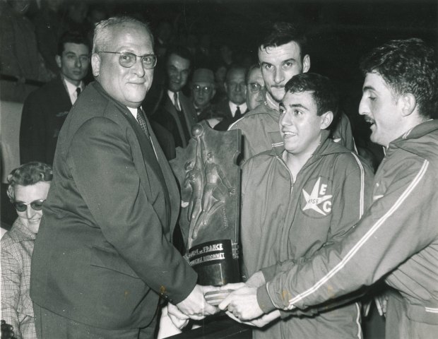 1959, l’Etoile de Charleville remporte la Coupe de France. Le partenariat a pris fin l’année précédente, mais on peut encore lire sur le trophée : « challenge Dubonnet », en référence à la firme qui soutenait la compétition depuis sa naissance en 1953. Jean-Paul Beugnot reçoit le trophée sous l’œil espiègle de Renato William Jones, Secrétaire Général de la FIBA, et de son éternel cigare.