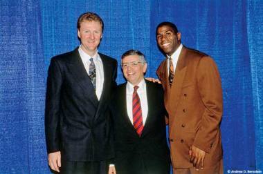 Comme si le destin s’en était mêlé, nos deux gaillards sont draftés par les deux plus grandes franchises de l’histoire. Earvin »Magic »Johnson portera le maillot des Lakers de Los Angeles et Larry Bird celui des rivaux de la côte est, Boston. Ces hommes que tout ou presque les oppose. Magic, afro américain, sourire enjôleur, le rôle parfait pour jouer les stars à paillettes à Hollywood devant les feux de la rampe et de l’autre côté, Larry, blanc, pas athlétique pour un sou, faciès peu charismatique au premier abord, le profil idéal pour la tunique des Celtics. Chacun a tout simplement élevé son équipe vers les sommets dès leur arrivée, Magic est champion NBA lors de saison rookie, Larry Bird l’emporte l’année suivante. Puis vient enfin le duel tant attendu, 1984, 1985, 1987 sans oublier bien sûr les multiples matchs de saison régulière. Des confrontations de légende, physique, intense où le public du Boston Garden et du Forum d’Inglewood donnent de la voix. Au cours des années 80, les deux géants ont remporté huit titres (laissant une bague à Julius Erving au passage) et six trophées de MVP de la saison régulière. Les aléas de la vie quotidienne ont fait que chacun a du prématurément stopper sa carrière professionnelle avec toutefois un final d’anthologie en jouant ensemble pour leur pays lors de la célèbre constitution de la Dream Team en 1992.