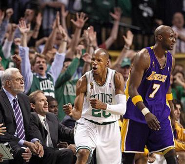Que ce fut long et douloureux pour les Celtics. Après la retraite de Larry Bird, le départ des différents cadres et la malchance des disparitions de Len Bias et Reggie Lewis, la reconstruction fut laborieuse. Les années 90 et 2000 n’ont franchement pas été une réussite à Boston et il aura fallu monter deux transferts digne de ce nom pour obtenir deux grands joueurs pour entourer Paul Pierce, superstar des verts depuis des années mais trop esseulé jusqu’ici. C’est ainsi que Ray Allen et Kevin Garnett arrivèrent dans le Massachussetts au cours de l’été 2007 et avec ce big three, une saison énorme avec 66 victoires et un statut de grand favori au même titre que les Lakers. A la différence de leurs rivaux, Los Angeles s’est renforcé seulement à partir de la mi-saison pour avoir les services de Pau Gasol, un transfert qui avait fait couler beaucoup d’encre au vu de la contrepartie (Kwame Brown, un très vieux Aaron McKie, Javaris Crittenton et les droits sur Marc Gasol). Avec l’intérieur espagnol, les Lakers passent un cap et deviennent un sérieux candidat au titre avec les Spurs à l’ouest. Les deux franchises terminent premières de leur conférence respective, Los Angeles finit avec 57 succès au moment d’aborder les playoffs.