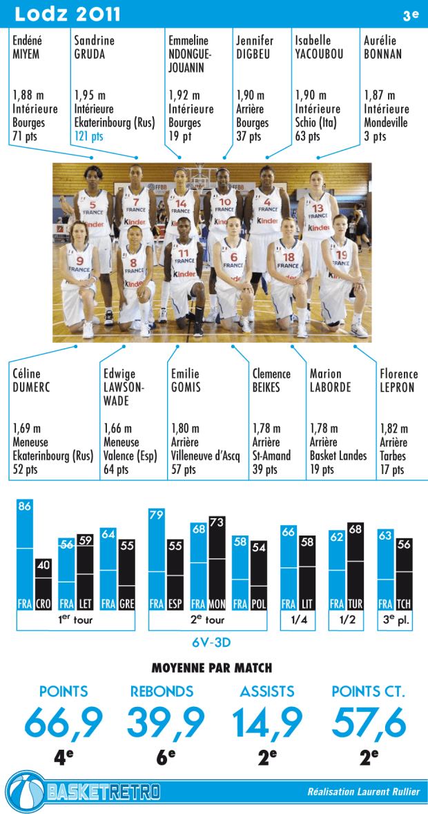 Deux ans après avoir gagné le titre de championne d’Europe en 2009, l’équipe de France féminine a de nouveau inscrit son nom au palmarès de cette compétition en enlevant la médaille de bronze à l’Euro 2011 en Pologne. Pour acquérir celle-ci face à la République Tchèque, les Françaises ont pu compter sur leur intérieure Sandrine Gruda, auteur de 26 points. Retour sur la victoire tricolore 63-56 face aux Tchèques lors de ce match pour la troisième place.