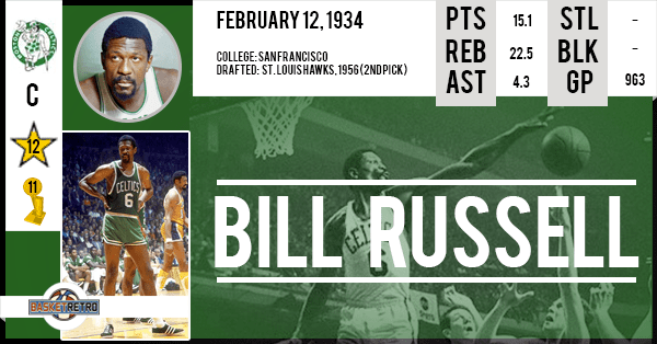 Spécialiste de la défense par excellence, Bill Russell fut, avec Bob Cousy, la pierre angulaire des Boston Celtics lors de leur domination sur l’ensemble de la ligue avec onze titres en treize ans. Ses qualités physiques et sa détente lui permettaient de capter un nombre impressionnant de rebonds ou de modifier la trajectoire des tirs de ses adversaires qui redoutaient son incroyable habilité au contre. Hélas, à cette époque cette catégorie n’était pas comptabilisé parmi les statistiques mais nul doute que Bill Russell aurait établi des records en la matière. Véritable pionnier de l’histoire du jeu, il est le premier joueur noir à atteindre le statut de « superstar » dans la ligue et devient l’un des rares à endosser le rôle d’entraîneur joueur avec les Celtics, devenant par la même occasion le premier afro-américain à coacher une équipe de sport américain professionnelle. Véritable légende du sport et du combat civique américain, l’influence de Bill Russell est unanimement reconnue par ses pairs. En preuve de cette estime, le trophée de meilleur joueur des finales NBA porte désormais son nom.