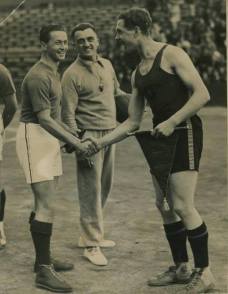 Amicale poignée de main entre les capitaines français et belge, Etienne Onimus (à gauche) et Robert Brouwer, lors de l’échange des fanions. Il s’agit de la sixième rencontre entre les deux formations, les Belges étant l’un des plus anciens adversaires des Bleus (le premier match avait eu lieu à Bruxelles en 1928). Ce jour-là, l’équipe de France s’impose sur le score de 50 à 17. Comme l’indique le titre de l’article de L’Auto, la rencontre a lieu au stade Roland-Garros, mais c’est bien de basket-ball qu’il s’agit.