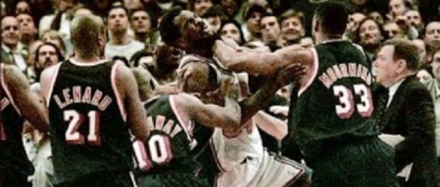 30 mai 1998, Les Knicks affrontent le Heat dans le Game 4 du premier tour. A 1,4 secondes de la fin, New-York mène 90-85 et va égaliser à 2 matchs partout. C’est à ce moment qu’une altercation éclate entre Larry Johnson et Alonzo Mourning. Jeff Van Gundy se précipite pour tenter de séparer les deux hommes et se retrouve… accroché à la jambe du pivot du Heat.