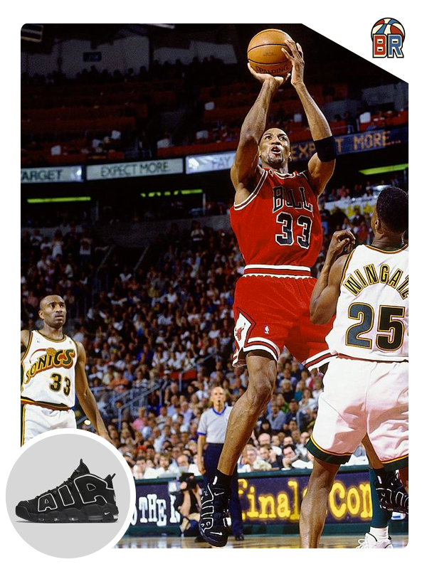 Le retour du numéro 23 l’année suivante n’empêche pas le 33 des Bulls de tirer son épingle du jeu dans le sneaker game. En 1996, Nike frappe un grand coup (de pub) en le chaussant des Air More Uptempo. Une paire qui ne brille pas par sa discrétion avec son énorme bulle d’air visible tout le long de la semelle, mais surtout en s’affublant d’un énorme « AIR » qui couvre toute l’empeigne. Une paire qui porte chance à son joueur puisqu’il les portera sur les podiums pour soulever son quatrième trophée en 1996 ainsi que sa seconde médaille d’or la même année.