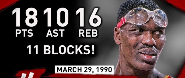 Aussi fort en attaque qu’en défense, il réalisa cette performance le 29 mars 1990 au Summit de Houston sous les yeux d’Alvin Robertson, joueur des Bucks, et auteur du deuxième quadruple-double de l’histoire de la NBA. Robertson a félicité d’ailleurs Olajuwon pour son excellent match : « C’est une superbe réussite. Je suis ravi pour lui. Je ne pense pas que ca soit la dernière fois (qu’il fasse ça) ». (source : United Presse International Archives)