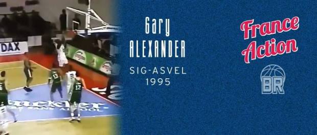 Joli move du puissant Gary Alexander contre Villeurbanne: un spin move en finesse suivi d’un de ses arrachages de cercle dont il a le secret! SIG Strasbourg contre l’ASVEL, Championnat de France de Pro A 1995.
