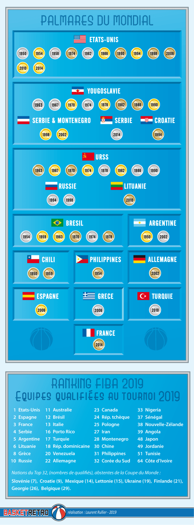 Sur les 54 nations seulement qui ont participé au moins une fois au Mondial masculin, 17 seulement ont connu la joie d’un podium… Le tableau des médailles de1950 à 2019.