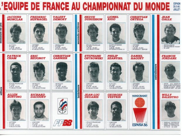 La dixième version du Mondial se déroula du 5 au 20 juillet 1986 en Espagne sur les sites de Saragosse, Malaga, Ténérife et El Ferrol, puis les phases finales à Barcelone et Madrid. La formule retenue constituée de quatre groupes de six Equipes permettait aux trois premiers de chaque poule d’accéder au deuxième tour de cette épreuve. L’Equipe de France bénéficiait d’une pré saison prolifique avec un Tournoi de Noel relevé et porteur d’espoir ainsi que des matches amicaux de Karlsruhe et Saint Sébastien puis à Paris face aux USA en préparation avec une victoire à la clef (95/83) contre les futurs Champions du Monde de cette session Espagnole ! ! Une » reprise « tonique et vivifiante en juin sur le sable de la station balnéaire du Touquet dirigée par Willy Ballestro était de nature à rassurer les joueurs et le Staff National. Mais avec le recul, Coach Jean Galle éprouvait un immense regret et une certaine amertume par rapport aux résultats (la France classée 13 ème sur 24) qui ne reflétaient pas l’honorable parcours des Tricolores.