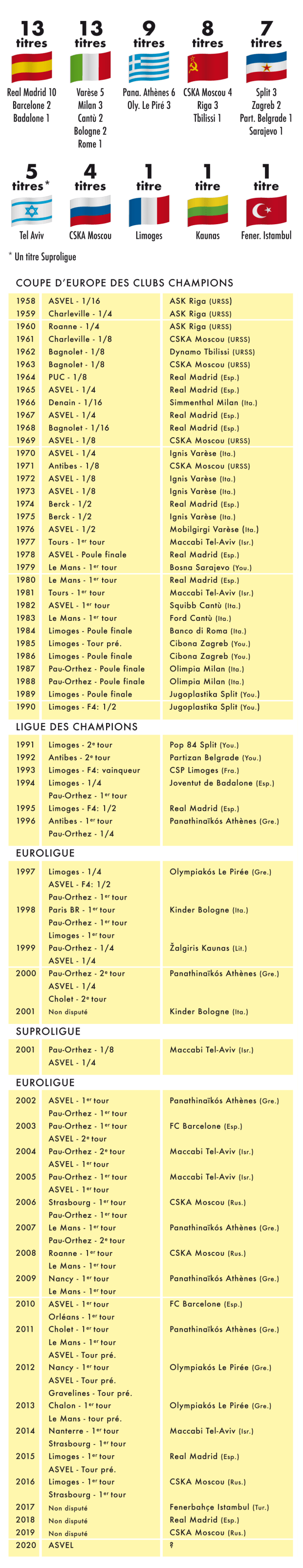 Le basket français est de retour en Euroleague grâce à l’invitation faite à l’ASVEL LDLC de Tony Parker. Retour sur la participation des clubs tricolores dans les 61 éditions, moins trois, de la reine des compétitions européennes.