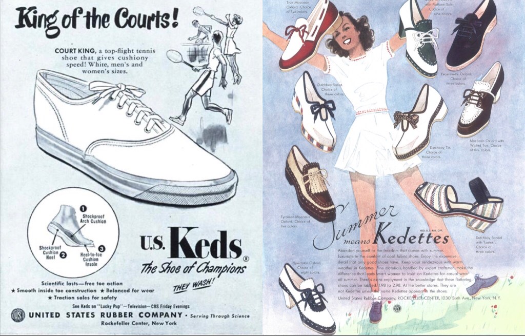 Le siècle avançant, Keds renforce ainsi sa popularité avec ses modèles iconiques énormément portés par les jeunes filles ainsi que par les stars féminines des écrans. En premier lieu, Keds bénéficie du développement du cheerleading aux États-Unis. Créée à la fin du 19e siècle, l’activité est ouverte aux jeunes femmes en 1923 et les modèles souples Keds conviennent parfaitement à cette pratique. Le cheerleading explose dans les années 50 et 60 et la tenue associant le pull col en V, la jupe plissée, les chaussettes montantes et les Keds aux pieds est extrêmement populaire. Les chaussures passent ainsi de la dimension sportive des débuts à l’utilisation au quotidien et deviennent un bien de consommation populaire. D’autre part, de nombreuses célébrités mettent la marque en valeur: Marylin Monroe, Audrey Hepburn, Jackie Kennedy Onassis ou bien encore Yoko Ono qui porte des Keds lors de son mariage avec John Lennon en 1969.