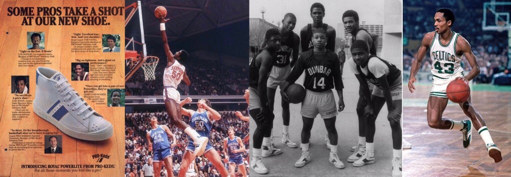 Uniroyal, successeur de l’U.S. Rubber Company, vend la division chaussures de son activité à Stride Rite en 1979 et l’influence de Pro-Keds diminue nettement à partir des années 80. Ci-dessous à gauche, une dernière pub avec les vieillissants Jo Jo White, Lou Hudson et Tiny Achibald, qui terminent leurs carrières, respectivement aux Warriors, Lakers et Celtics. Les modèles, plus modernes, évoluent, passant du tissu au cuir. Darryl Dawkins joue une saison à Philadelphie avec des Pro-Keds. Les universités de Louisville et Michigan State sont équipées par Pro-Keds. Ralph Sampson porte les modèles «Royal Powerlite» et « Shot Maker » à l’université de Virginia mais le numéro 1 de la draft 1983 signe avec la marque Puma à son entrée en NBA. Pro-Keds est aussi le fournisseur des chaussures d’une des équipes de lycée les plus renommées de l’histoire: la Dunbar High School, classe 1982-83, avec Muggsy Bogues, le regretté Reggie Lewis et Reggie Williams. Trois élèves au futur destin NBA ! On peut aussi voir Gerald Henderson, l’arrière de Boston, avec des « Shot Maker » du plus beau vert lors des NBA Finals 1984 opposant les Celtics aux Lakers.