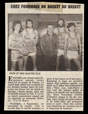En effet, Marc, Jean-Pierre, Luc et Guy Fourmaux ont joué TOUS LES QUATRE en même temps dans la même équipe en championnat de France, une curiosité nationale qui perdura de longues années… et qui se perpétua avec l’avènement de la génération suivante avec leurs fils (Gwenaël Harlé et Loïc Harlé les fils d’Annie, la seule fille de Mr et Mme Fourmaux ; Aymeric, Yohann et Gaël Fourmaux et leurs cousins Alexis et Nicolas Villain) tous ensemble dans l’équipe 1 également en NM3 dans les années 90-2000 ! On vit même le père jouer avec le fils en NM3 (Jean-Pierre et Yohann), avant de voir le père manager son fils et ses neveux…