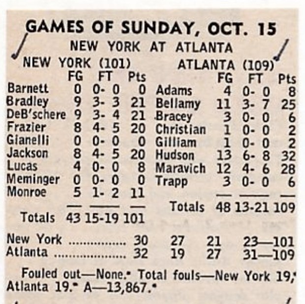 La rencontre opposa les locaux face aux Knicks de New York, et bonne nouvelle pour le public présent ce soir-là, son équipe remporta le match sur le score serré de 109 à 101. Phil Jackson et son compère n’ont rien pu faire face au chaud bouillant Lou Hudson et ses 32 points.