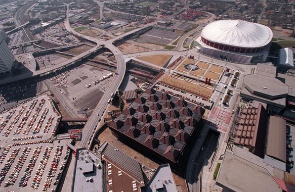 En effet, tout commença avec l’achat par Tom Cousins, un grand entrepreneur local, d’un grand lot de terres en plein centre d’Atlanta, en 1966. Or, il faut savoir que le centre d’Atlanta à l’époque, et surtout dans ce secteur n’était pas un quartier prisé mais plutôt une zone industrielle sans charme et même plutôt mal fréquentée. Il décida d’y construire un large parking mais justement l’attrait d’y laisser sa voiture n’était pas vraiment là. Il fallait donner de l’intérêt à ce parking. Oui mais comment ?