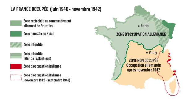 Le 10 juillet 1940, l’Assemblée nationale vote les pleins pouvoirs constituants au maréchal Pétain alors chef du gouvernement. Ce mandat censé mettre en place une nouvelle constitution garantissant les droits du travail, de la famille et de la patrie va aboutir dans les faits sur la mise en place d’un régime autoritaire et dictatorial connu sous le nom de Régime de Vichy. Un culte de la personnalité se met alors progressivement en place autour de la figure du maréchal Pétain, héros de la Grande Guerre et qui apparaît en ces temps de désastre national comme un véritable phare dans la nuit pour bon nombre de français. Si le gouvernement de Vichy conserve la souveraineté de l’ensemble du territoire de France métropolitaine, l’armée allemande occupe le littoral atlantique et la partie nord de l’Hexagone selon la convention d’armistice du 22 juin 1940.
