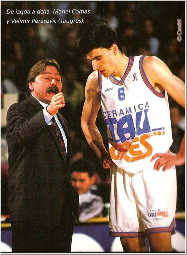 Quelque soit le nom de l’équipe, Vitoria aura connu la véritable ivresse du pouvoir continental trois fois dans son histoire. Une victoire pour deux défaites mais avec la garantie de voir son nom au plus haut sommet du basket européen. Lors de la saison 1995-1996, ce sera d’abord la victoire en Coupe Saporta sous l’appellation de « Taugres Vitoria » et la houlette de Manel Comas, aujourd’hui décédé, face aux Grecs du PAOK d’un certain Peja Stojaković, futur tireur à longue distance des Kings de Sacramento. Dans une ambiance bouillante et à domicile, avec un effectif composé du pivot américain, Kenny Green, un ancien d’Efes Pilsen, du Croate Velimir Perasović, du jeune Carlos Cabezas et de Jorge Garbajosa, les Basques remporteront le trophée, 88 à 81 face aux coéquipiers du pivot grec Efthýmios Rentziás qui partira à Barcelone et Ülkerspor, en Turquie. Dans les rangs grecs, à noter également la présence, en tant qu’adjoint, d’un certain Dimitris Itoudis, ancien adjoint de Željko Obradović au « Pana » et actuel coach du CSKA Moscou. Sortis d’un groupe composé notamment du CSP Limoges et Partizan Belgrade, Taugres terminera premier de sa poule. Une finale maitrisée pour une équipe qui aura attendu trois finales avant de réussir à enfin remporter ce trophée. Derrière les 31 points et 14 rebonds du pivot portoricain Ramon Rivas (ancien des Celtics en 1988-1989), Perasović apportera 17 points et 19 pour Marcelo Nicola. Défaits lors de la saison 93-94 par l’Olimpija Ljubljana (91-81) et la suivante (94-95) par le Benetton Treviso d’un certain Petar Naumoski, la troisième finale sera la bonne. Cette Coupe d’Europe constituant à ce jour le seul trophée sur la scène européenne, tous noms confondus, des Basques.