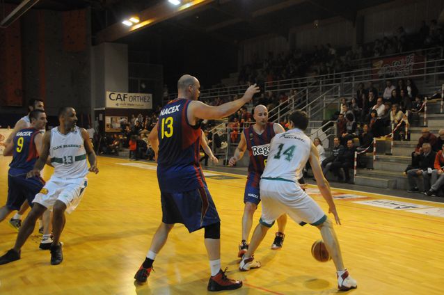 En aide défensive sur Thierry Gadou, face à Antoine Rigaudeau et Stéphane Risacher lors d’un match des anciens du Barça contre anciens de l’Elan Béarnais. (Photo paysdesgaves.com)