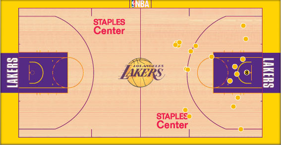 Ce jour là, la Star des Lakers afficha au final un énorme 28 sur 46 aux tirs pour un joli 60% de réussite agrémenté d’un 7/13 à trois points plus encore 18/20 aux lancer-francs et pour finir, 6 rbds et 3 stl en 42 minutes.