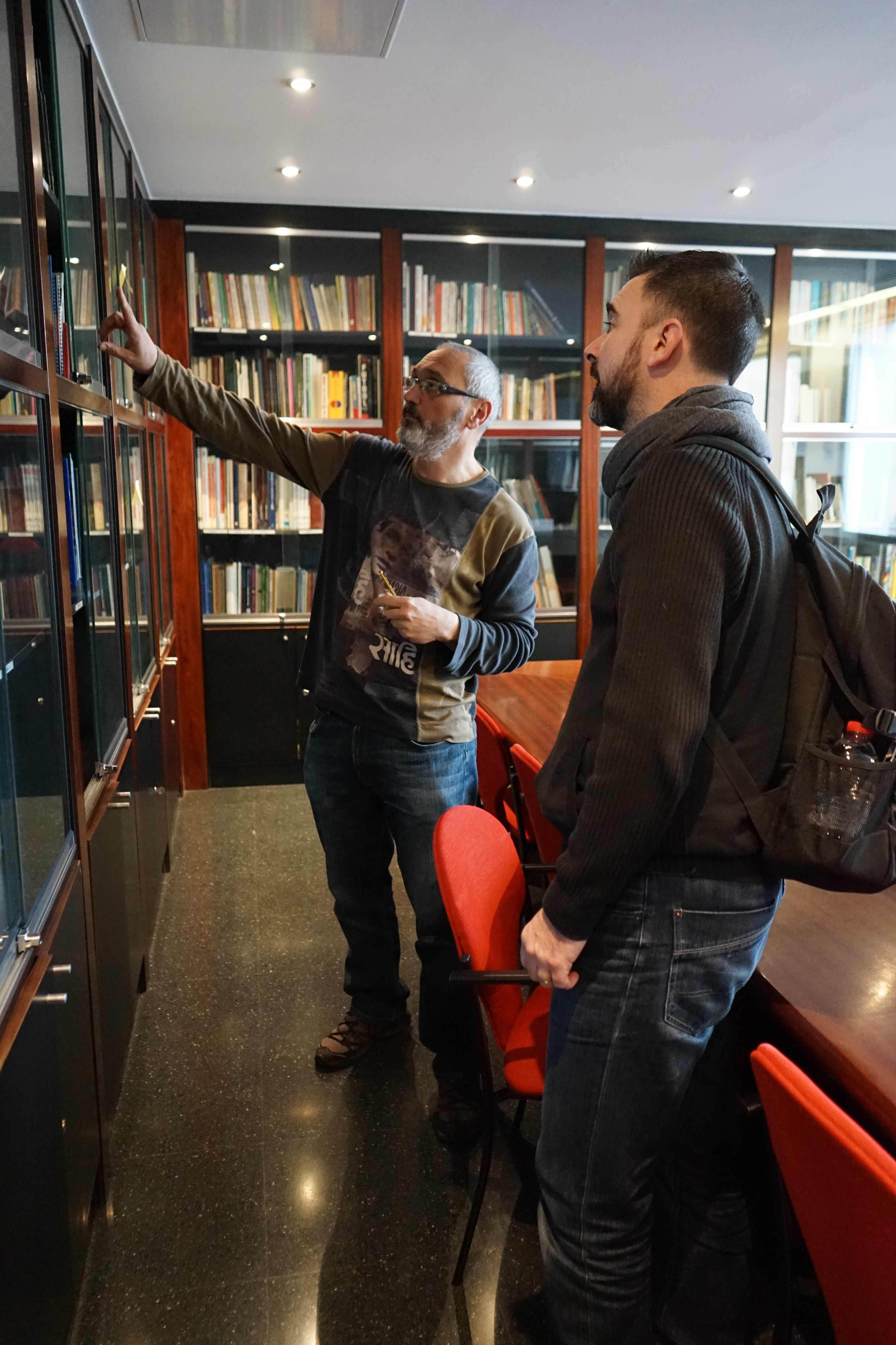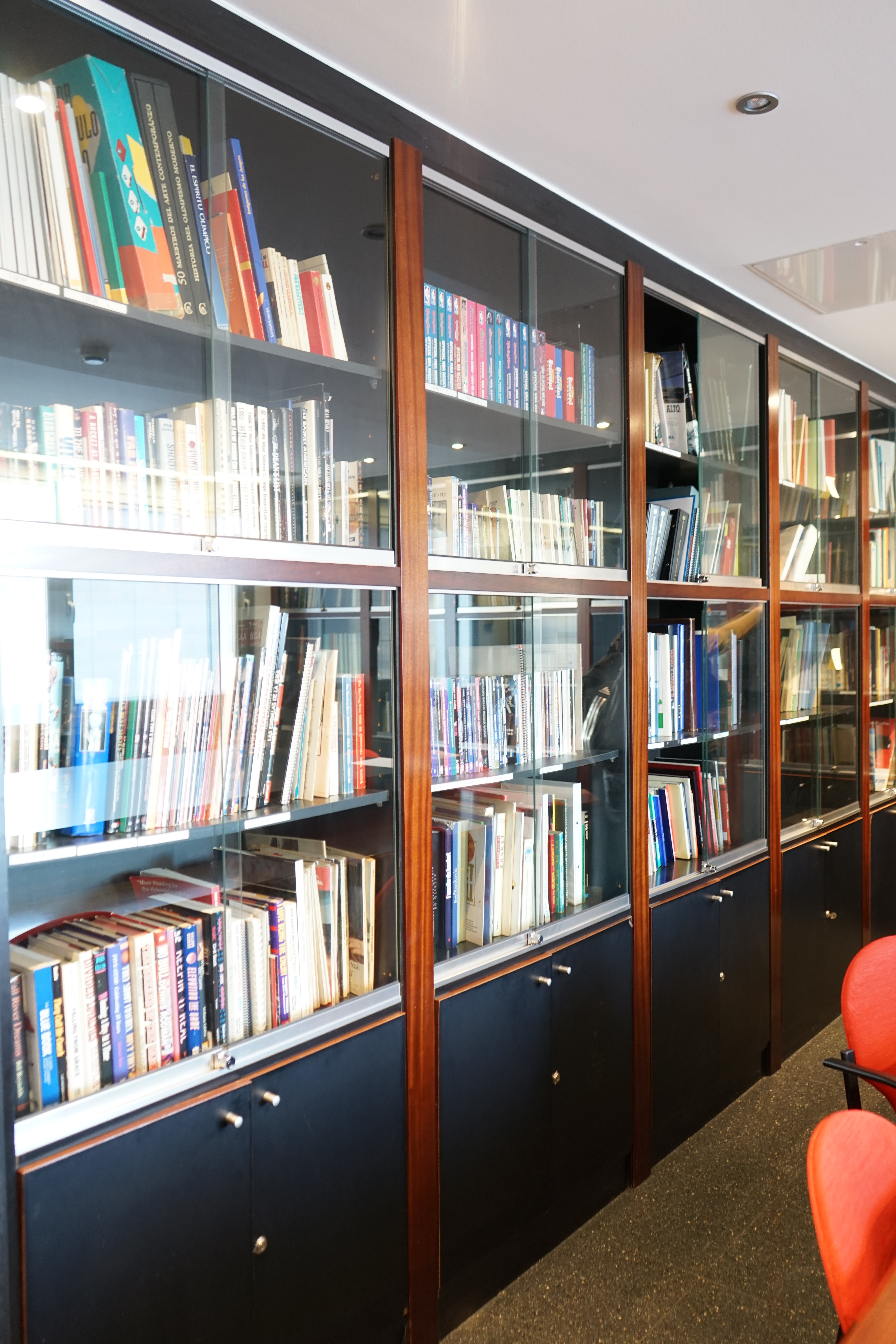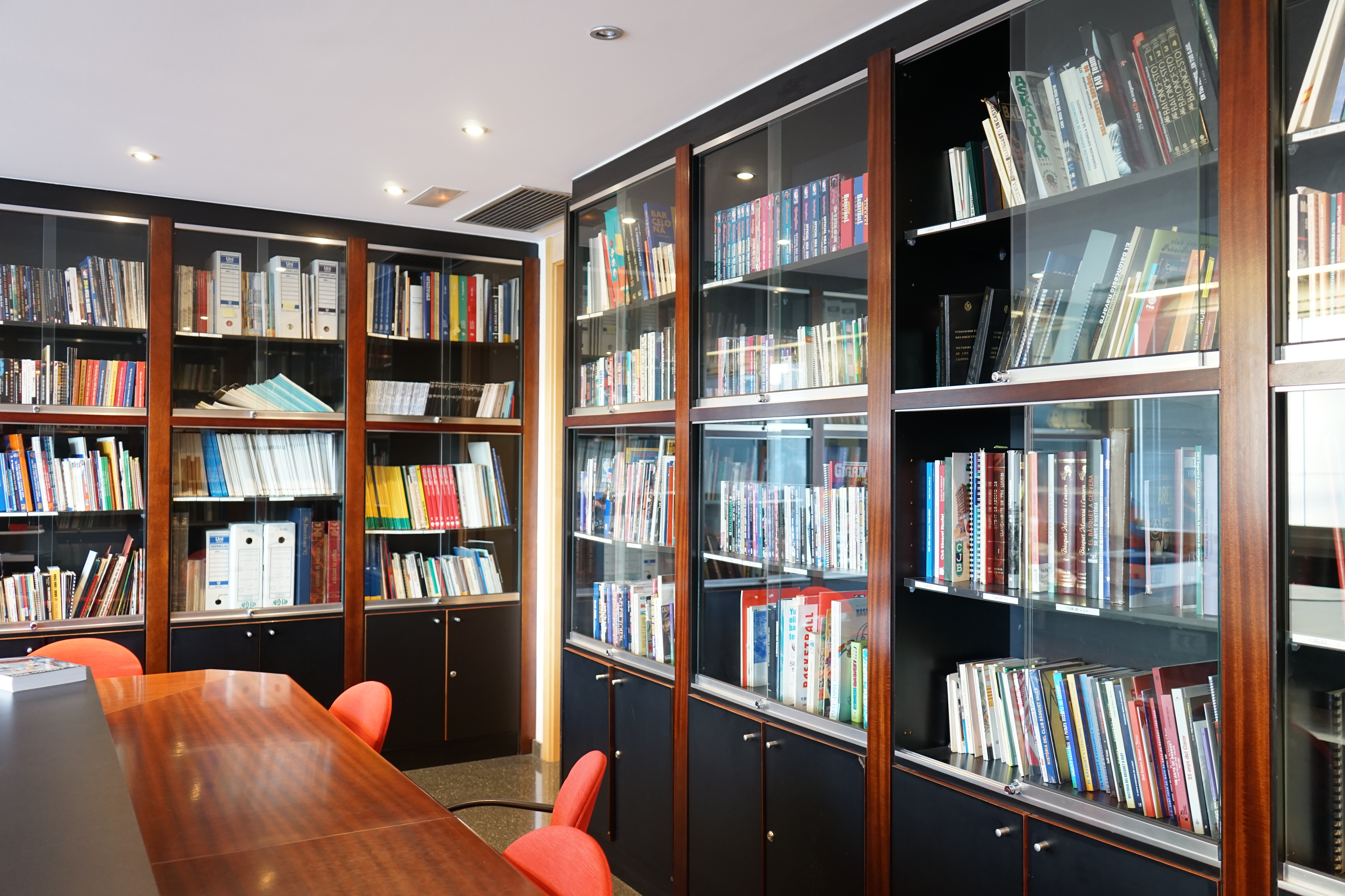 Entre deux vitrines, un couloir nous mène vers deux autres salles. L’une, sans fenêtre, est un lieu de stockage pour les documents anciens, et fragiles. Ce sont les originaux qui sont numérisés au fur et à mesure. L’autre salle, plus intimiste, est réservée à la lecture et au travail de recherche. Trois pans de murs sont recouverts d’immenses bibliothèques vitrées, avec toutes les publications du basket espagnol, mais pas que ! On y retrouve aussi des magazines américains, français, italiens…